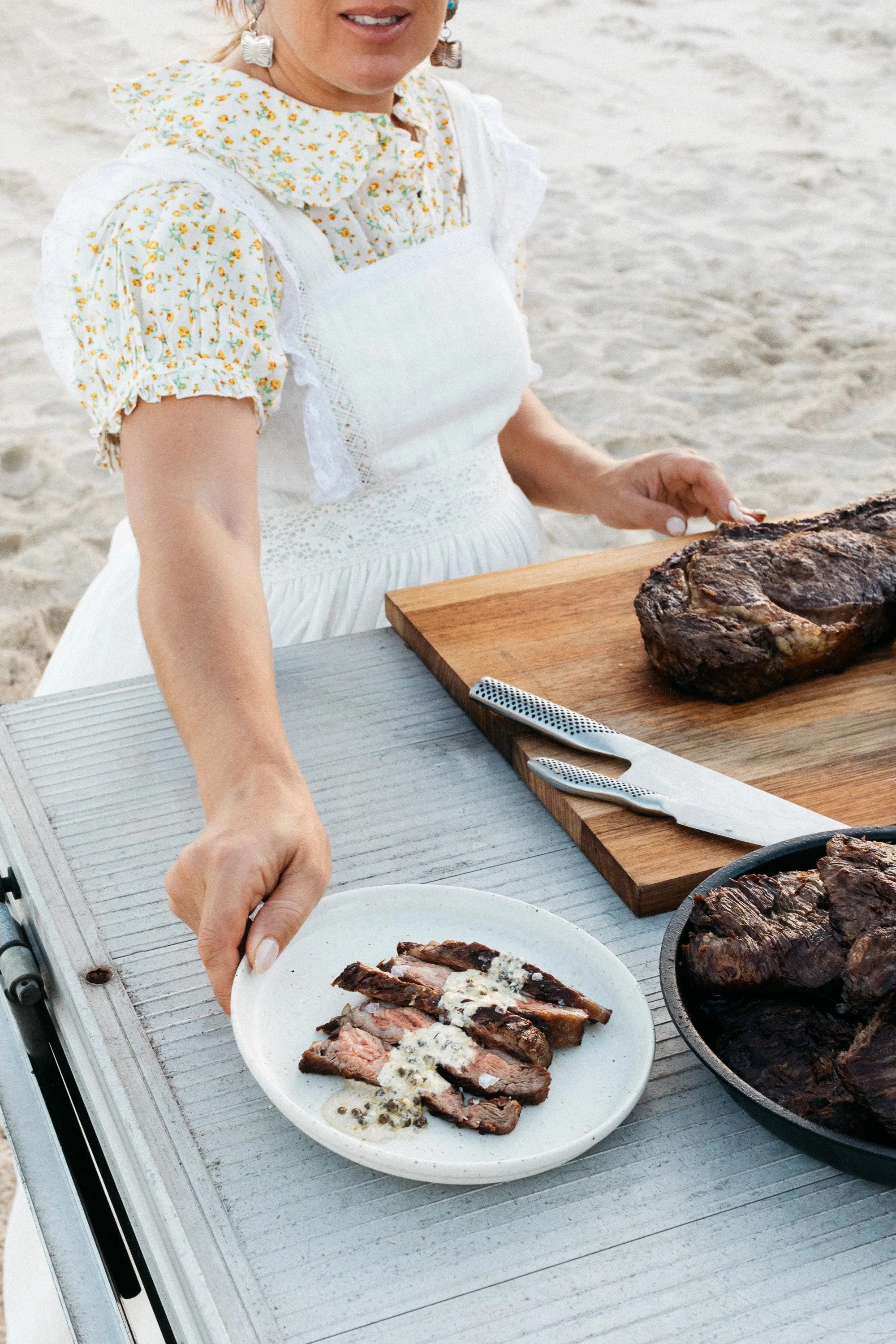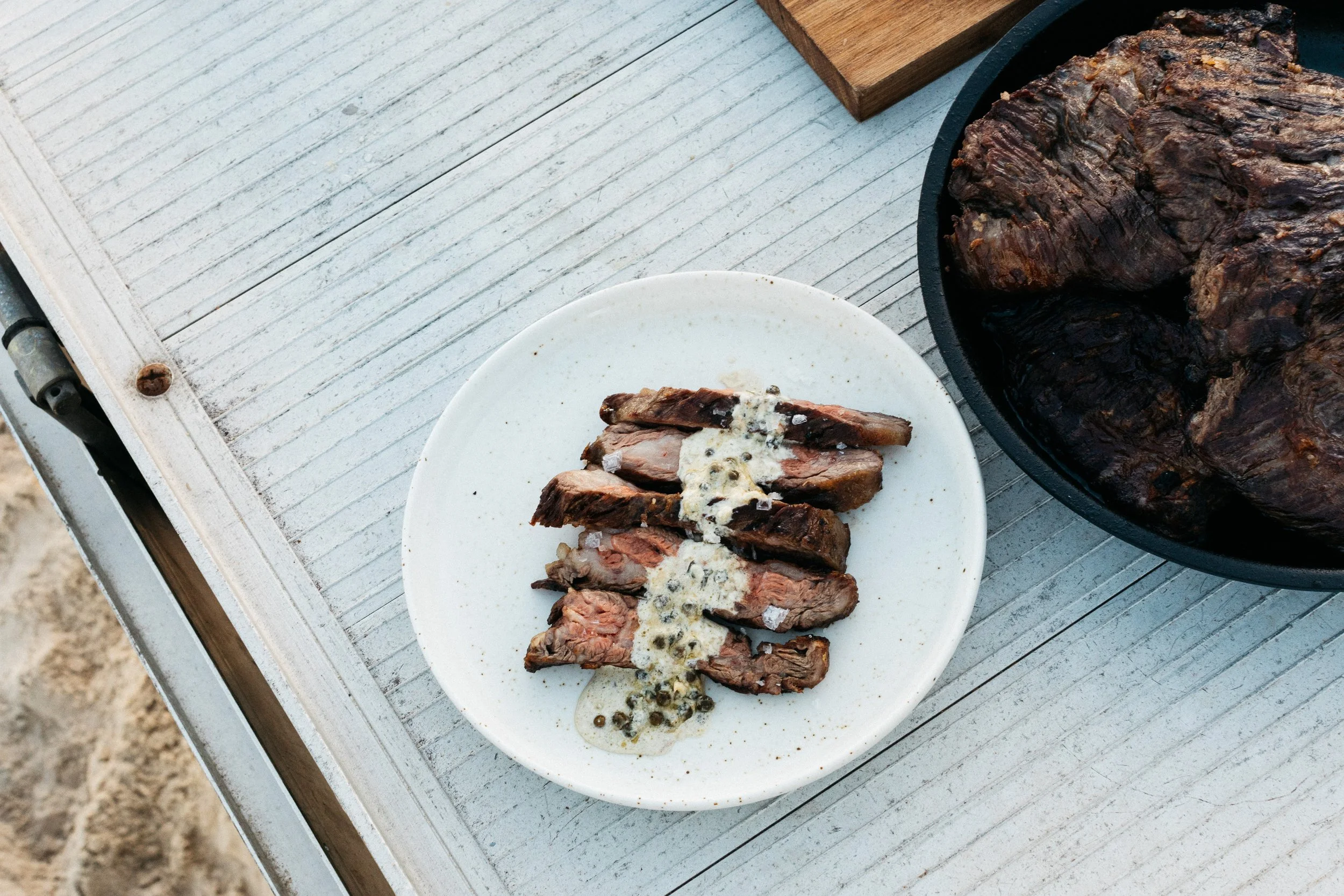 Carefully remove the hot pan, add a small amount of oil, and place the steak in the pan. Immediately put it back into the Gozney. Sear for 2–3 minutes on the first side until a dark crust forms.
