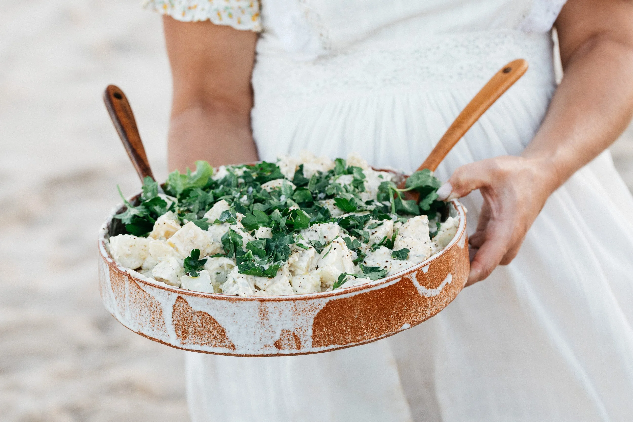Add warm potatoes to the dressing. Fold in red onion and fresh herbs.